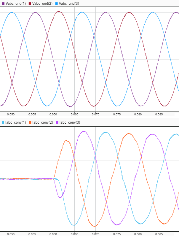 Vabc_grid = run2.getSignalsByName('Vabc_grid'); Iabc_conv = run2.getSignalsByName('Iabc_conv'); plotOnSubPlot(Vabc_grid.Children(1),1,1,true); plotOnSubPlot(Vabc_grid.Children(2),1,1,true); plotOnSubPlot(Vabc_grid.Children(3),1,1,true); plotOnSubPlot(Iabc_conv.Children(1),2,1,true); plotOnSubPlot(Iabc_conv.Children(2),2,1,true); plotOnSubPlot(Iabc_conv.Children(3),2,1,true);
