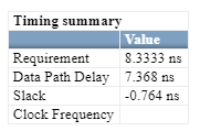 The synthesis results shows negative slack, indicating that timing constraints are not met. The clock frequency is not calculated when timing constraints are not met.