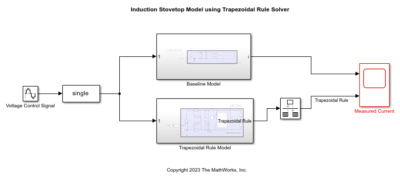 This example models an induction stovetop. The network model uses a half-bridge with subcycle averaging to generate alternating current to power induction coils. The model contains a network with fast RLC time constants. With the local solver set to Trapezoidal Rule, you can simulate the model with a larger time step and increased accuracy than with a Backward Euler local solver. Some electrical topologies such as wireless power transfer circuits cannot be accurately simulated with a Backward Euler solver with a time step larger than 100 ns. For real-time simulation, the Trapezoidal Rule solver lets you run these models with larger time steps (~1 μs) for specific hardware requirements.