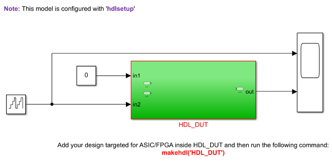 In this model, HDL_DUT Subsystem is the DUT and blocks outside this Subsystem form the test bench. You can develop your HDL algorithm inside the HDL_DUT Subsystem. This template model is preconfigured for HDL code generation.