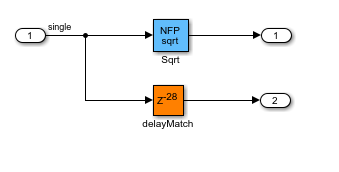 Open the hdlcoder_nfp_delay_allocation Simulink® model. The model uses single data types and computes the square root. The model has a parallel path to illustrate how the code generator balances delays.