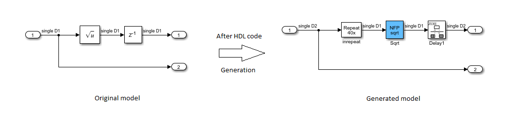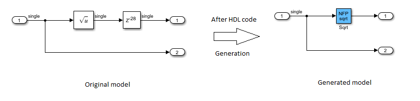 In the generated model, you see that the NFP Sqrt block absorbs the Delay block adjacent to the Sqrt block in your original model. This delay absorption occurs because the operator latency is equal to the Delay length. The code generator therefore avoids the additional latency in your model.