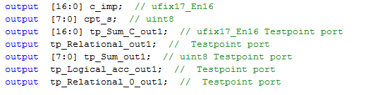 You can see the test point ports at the top level module declaration. These ports have the prefix tp_ and a comment to indicate that they correspond to test point ports. If you specify VHDL® as the target language, you can see the test point ports in the entity declaration.