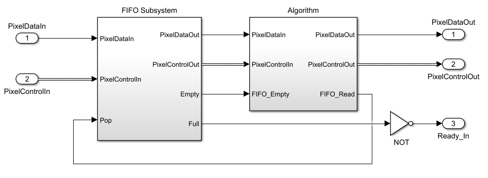For example, you can have a FIFO in your DUT to store some video data before processing the signals. Use a FIFO Subsystem that contains HDL FIFO blocks to store the Pixel Data and the Pixel Control Bus signals. To apply the backpressure to the upstream component, model the Ready signal based on the FIFO Full signal.