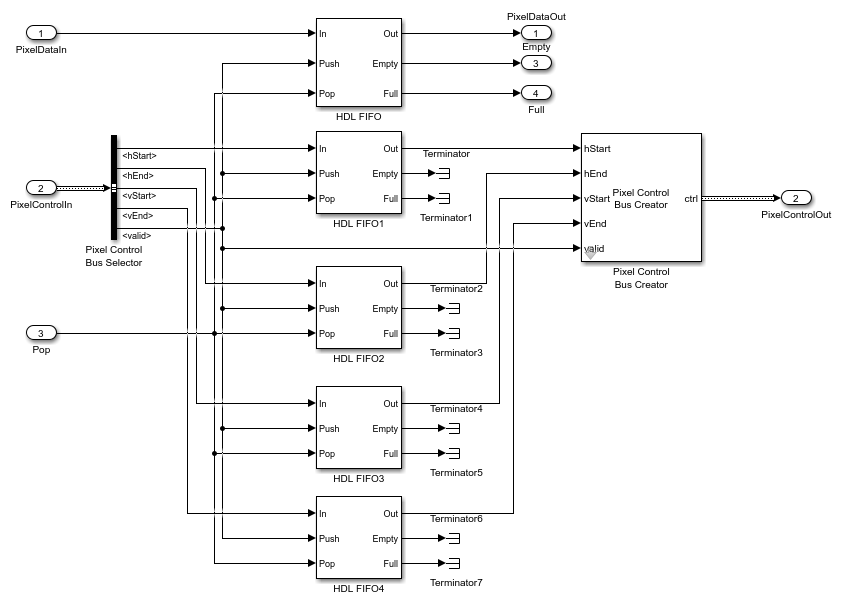 The FIFO Subsystem block uses HDL FIFO blocks for the Pixel Data and for the Pixel Control Bus signals.