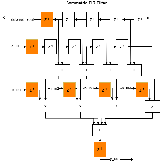 This figure shows how the algorithm is implemented in hardware when running synthesis on the generated code with adaptive pipelining on. The additional delays added from adaptive pipelining and delay balancing are shown in orange, along with the original input and output pipelines.