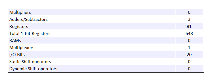 HDL Coder™ displays the Code Generation Report. In the report, select the High-Level Resource Report section. The design consumes 81 registers and 648 1-bit registers. By default, the MapPersistentVarsToRAM property is disabled and the code generator does not infer or consume RAM resources.