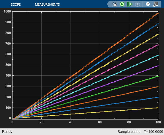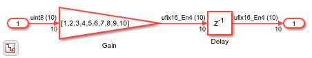 The model accepts a 10-element vector signal as input and multiplies each element by a gain value that is one more than the previous value.