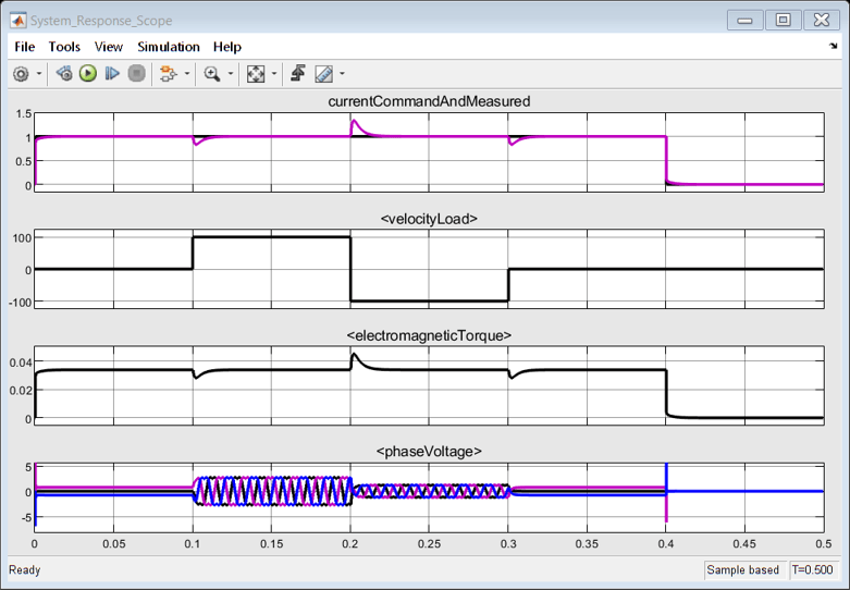 hasSimPowerSystems = license ('test', 'Power_System_Blocks'); if hasSimPowerSystems open_system('hdlcoderFocCurrentTestBench') % set half-precision floating-point model in the testbench set_param('hdlcoderFocCurrentTestBench/Controller', 'ModelName', 'hdlcoderFocCurrentFloatHalfHdl'); set_param('hdlcoderFocCurrentTestBench','IgnoredZcDiagnostic','none'); sim('hdlcoderFocCurrentTestBench') set_param('hdlcoderFocCurrentTestBench','IgnoredZcDiagnostic','warn'); end