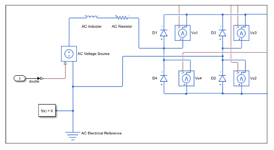 Simscape_system, you see four diodes arranged in a bridge configuration. For both positive and negative input values, this configuration provides a positive, rectified output.