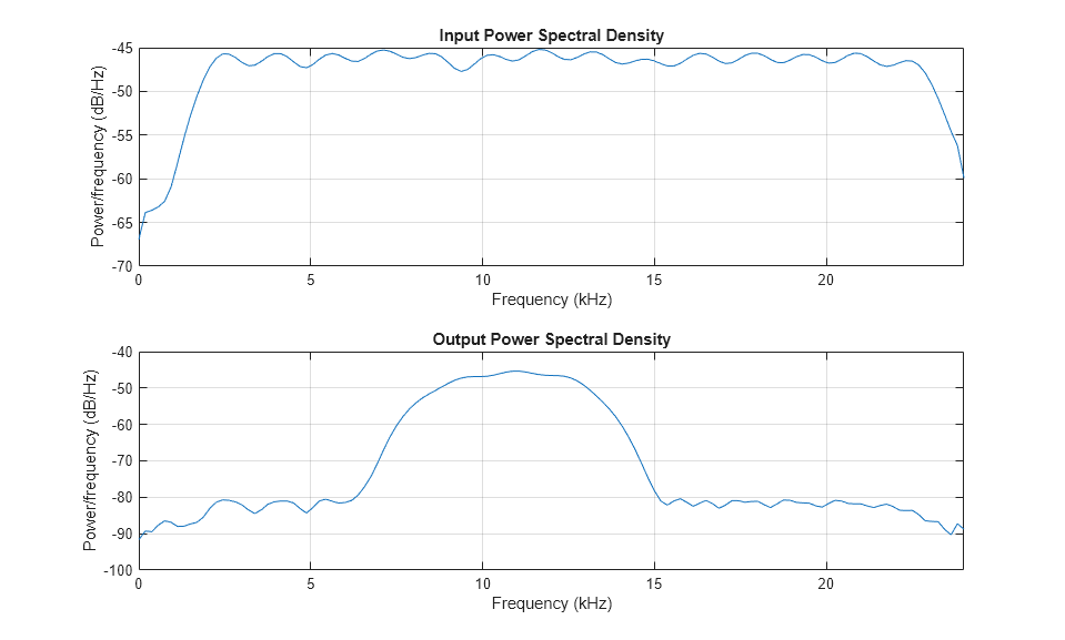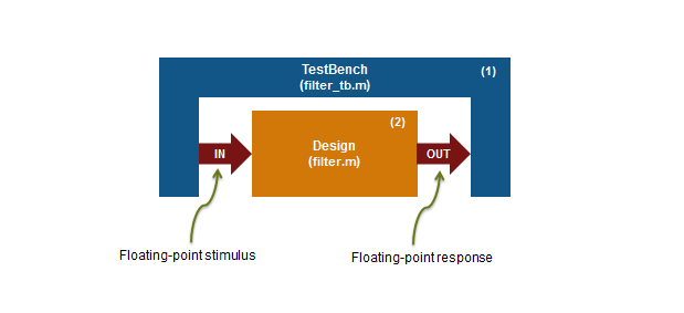 In the current example, the MATLAB testbench 'mlhdlc_filter_tb' has a single call to the design function 'mlhdlc_filter'. The testbench calls the design with floating-point inputs and accumulates the floating-point results for plotting.