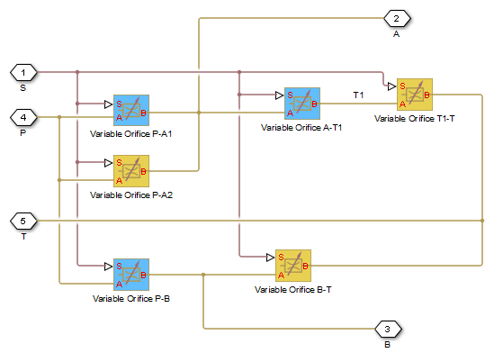 0corresponds to a zero-lapped valve. The default value is2.5e-3m.- Between ports T1 and T