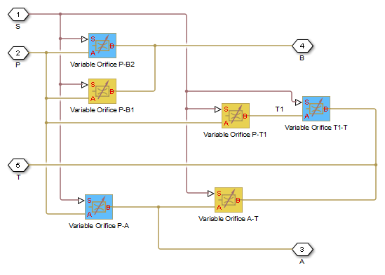 The 4-Way Directional Valve H block simulates a configuration of hydraulic continuous 4-way directional valve. Ports A and B are connected to port P in the left valve position. In the right position, port P is connected to port B, while port A is connected to port T. In neutral position, port P is connected to port T to unload the pump. The fluid is pumped in the valve through the inlet line P and is distributed between two outside hydraulic lines A and B (usually connected to a double-acting actuator) and the return line T. The block has four hydraulic connections, corresponding to inlet port (P), actuator ports (A and B), and return port (T), and one physical signal port connection (S), which controls the spool position. The block is built of six Variable Orifice blocks, connected as shown in the following diagram.