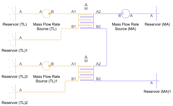 For example, to achieve a two-pass configuration on the moist air side and a single-pass configuration on the thermal liquid side, you can connect the moist air sides in series and the thermal liquid sides to the same input in parallel (such as two Mass Flow Rate Source blocks with half of the total mass flow rate), as shown below.
