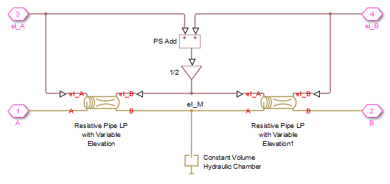 The Resistive Pipe LP with Variable Elevation blocks account for friction losses, while the Constant Volume Hydraulic Chamber block accounts for fluid compressibility. To reduce model complexity, you can use this block to simulate not only a pipe itself, but also a combination of pipes and local resistances such as bends, fittings, inlet and outlet losses, associated with the pipe. You must convert the resistances into their equivalent lengths, and then sum up all the resistances to obtain their aggregate length. Then add this length to the pipe geometrical length. By using the block parameters, you can set the model to simulate pipeline with rigid or flexible walls, including simulation of hydraulic hoses with elastic and viscoelastic properties.