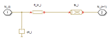 The nodes to which Constant Volume Hydraulic Chamber blocks are connected are assigned names N_1, N_2, …, N_n (n is the number of segments). Pressures at these nodes are assumed to be equal to average pressure of the segment. Intermediate nodes between Hydraulic Resistive Tube and Fluid Inertia blocks are assigned names nn_0, nn_1, nn_2, …, nn_n. The Constant Volume Hydraulic Chamber blocks are named ch_1, ch_2, …, ch_n, Hydraulic Resistive Tube blocks are named tb_0, tb_1, tb_2, …, tb_n, and Fluid Inertia blocks are named fl_in_0, fl_in_1, fl_in_2, …, fl_in_n.