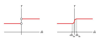 The asterisk denotes the thermal liquid port (A or B) at which a parameter or variable is defined. Subscript R denotes a reference value. The density at the interface entrance is smoothed below the mass flow rate threshold by introducing a hyperbolic term ɑ: