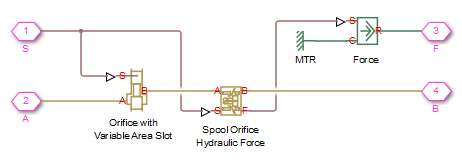 It consists of an Orifice with Variable Area Slot block, which simulates hydraulic properties of the orifice, connected in series with a Spool Orifice Hydraulic Force block. The force value computed in the block is exported through its port F and passed to the Force block.