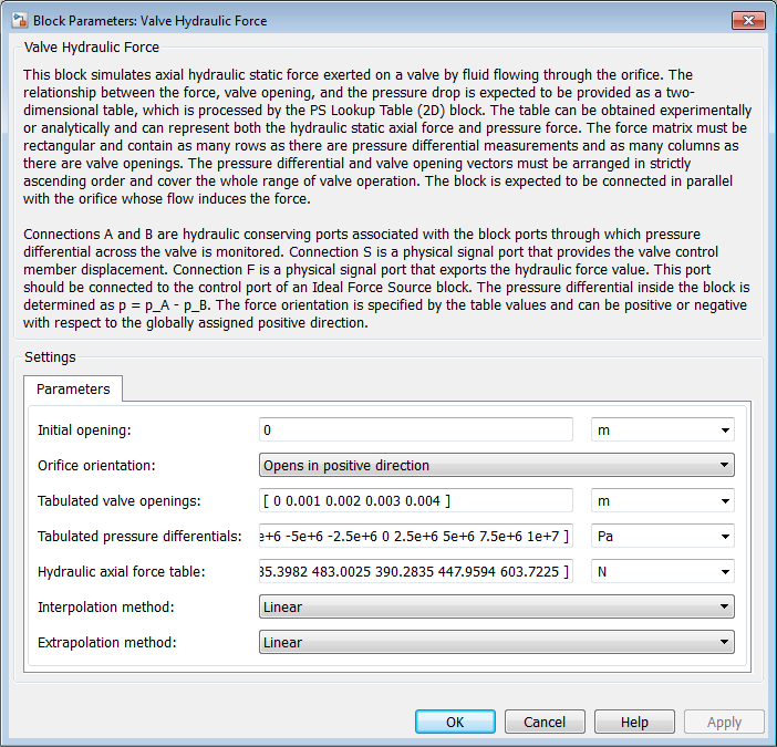 The Valve Hydraulic Force block simulates axial hydraulic static force exerted on a valve by fluid flowing through the orifice. The relationship between the valve opening, the pressure drop, and the force is provided as a two-dimensional table, which is processed by the PS Lookup Table (2D) block. The table can be obtained experimentally or analytically and can represent both the hydraulic static axial force and pressure forces. The force matrix must be rectangular and contain as many rows as there are pressure differential measurements and as many columns as there are valve openings. The pressure differential and opening vectors must be arranged in strictly ascending order and cover the whole range of valve operation. Connect the block in parallel with the orifice whose flow induces the force.