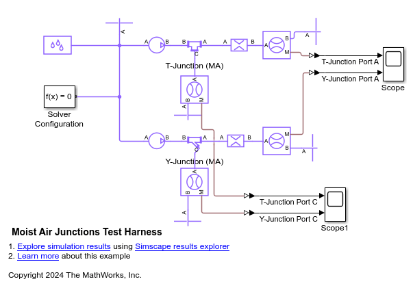 The Y-Junction (MA) block models a Y-junction consisting of a main branch and a side branch in a moist air network. The path between ports A and B is the main branch. The path between ports A and C or between ports B and C is the side branch. The side branch extends from the main branch at an angle specified by the value of the Junction angle between (A-C) parameter.
