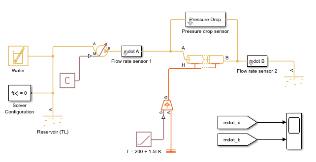 You can also use a Simscape model to confirm the analytical results. Open the PressureLossAndFlowRateInTLPipeInsulated model, which models constant flow through a pipe between two reservoirs. The model conditions match the conditions described above.