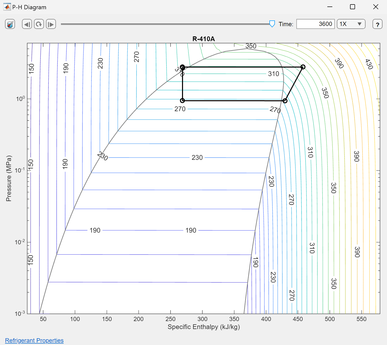 Double-click the P-H Diagram block to verify that the thermodynamic states reasonably match the nominal operating conditions.