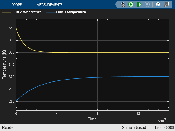 mdl = 'SimpleHeatExchangerParameterizationAndPerformanceTLTL'; open_system(mdl); set_param('SimpleHeatExchangerParameterizationAndPerformanceTLTL/Heat Exchanger (TL-TL)','hex_type','fluids.heat_exchangers.enum.FlowArrangement.ShellTube') set_param('SimpleHeatExchangerParameterizationAndPerformanceTLTL/Heat Exchanger (TL-TL)','shell_num','NumPass') set_param('SimpleHeatExchangerParameterizationAndPerformanceTLTL/Heat Exchanger (TL-TL)','heat_transfer_area_1','S_tubes') set_param('SimpleHeatExchangerParameterizationAndPerformanceTLTL/Heat Exchanger (TL-TL)','heat_transfer_area_2','S_tubes') set_param('SimpleHeatExchangerParameterizationAndPerformanceTLTL/Heat Exchanger (TL-TL)','liquid_volume_2','V_tubes') set_param('SimpleHeatExchangerParameterizationAndPerformanceTLTL/Heat Exchanger (TL-TL)','liquid_volume_1','V_shell') out = sim(mdl);