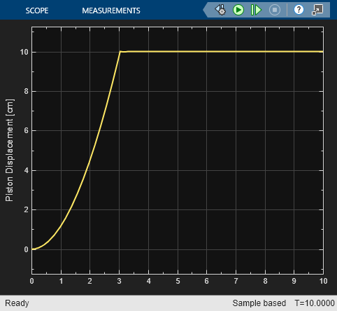 When you select Enable dynamic compressibility, the model runs without errors. However, compressibility in the fluid causes oscillation in the piston position of the actuator. Additionally, modeling compressibility causes the simulation to run slowly.