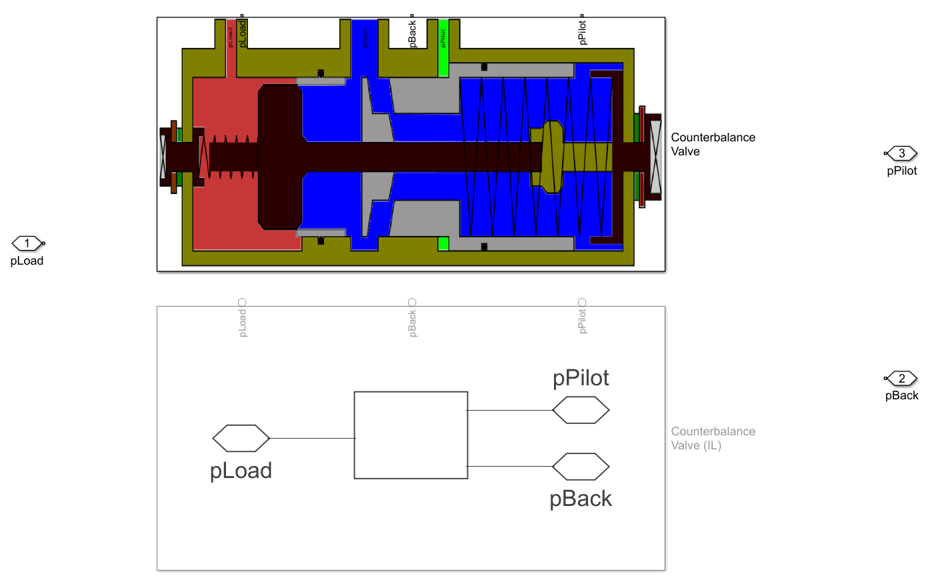 This subsystem demonstrates how to use the variant subsystem to model the counterbalance valve using detailed physics and the system level.