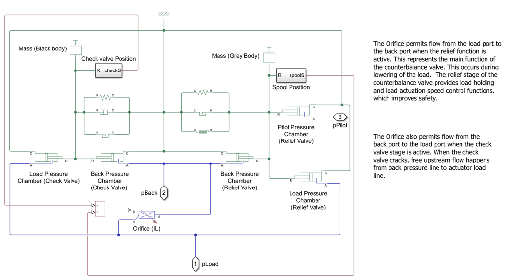This example shows how to model, parameterize, and test a counterbalance valve in detailed fidelity and system level fidelity using a variant subsystem. Running the model generates a plot of the flow from the load port to the back port due to the relief action of the counterbalance valve using the detailed fidelity variant. A counterbalance valve allows an upstream flow from the back port to the load port through the check valve stage, and it allows a downstream flow from the load port to the back port through the relief stage. Counterbalance valves help with load holding, load actuation speed control, and safety.