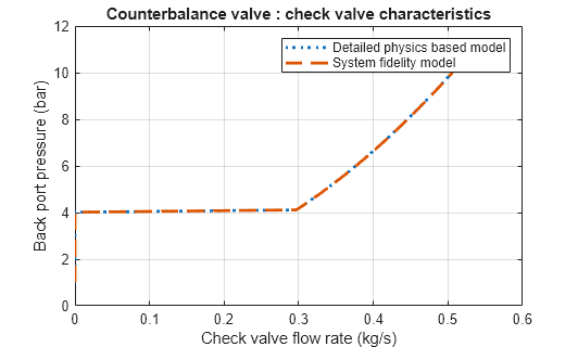 You can use this model to generate and compare the check valve stage characteristics of the counterbalance valve for the variant subsystems using CounterbalanceValveWithTestHarnessCheckCharacteristics script. To test for the check valve characteristics, you can ramp up the pressure at the back port while keeping the pressure constant at the load port.