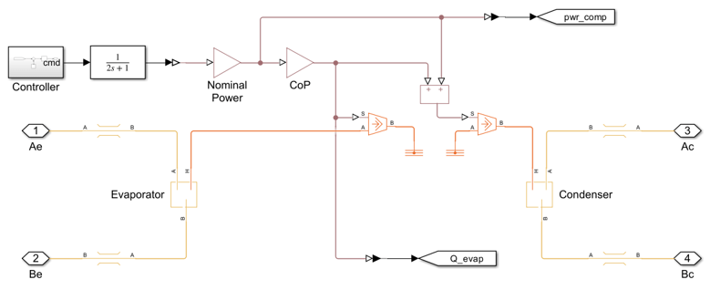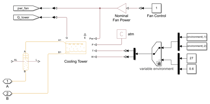 The model includes several variants. The chiller can be modeled directly using the System-Level Refrigeration Cycle (2P) block or abstractly based on pipe heat transfer. Pipe heat transfer is simpler and allows for more efficient simulation. The environmental conditions and the server farm heat load can be variable or constant. Variable conditions and load provide a more realistic scenario. Constant conditions and load allow for simpler component sizing and analyses.