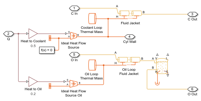 This example shows how to model an engine cooling system with an oil cooling circuit using Simscape™ Fluids™ Thermal Liquid blocks. The system includes a coolant circuit and an oil cooling circuit. A fixed-displacement pump drives coolant through the cooling circuit. The main portion of heat from the engine is absorbed by the coolant and dissipated through the radiator. The system temperature is regulated by the thermostat, which diverts flow to the radiator only when the temperature is above a threshold. The oil cooling circuit also absorbs some of the heat from the engine. The heat added to the oil is transferred to the coolant by the oil-coolant heat exchanger. The Radiator is the E-NTU Heat Exchanger (TL) block with the air-side flow controlled by physical signal inputs. The oil-coolant heat exchanger is the E-NTU Heat Exchanger (TL-TL) block. Both coolant pump and oil pump are driven by the engine speed.