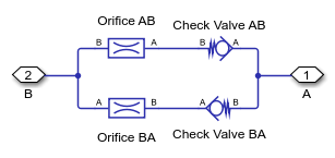 This example shows a flow rectifier circuit with four check valves and a flow control valve. It is used to allow a single flow control valve to control fluid flow in both directions. Similar to a Graetz circuit implemented with diodes, the check valves are arranged in such a way that flow always passes through the flow control valve in the same direction. In the Orifices subsystem, there are two more check valves that are used to select the orifice that the flow passes through depending on the flow direction.