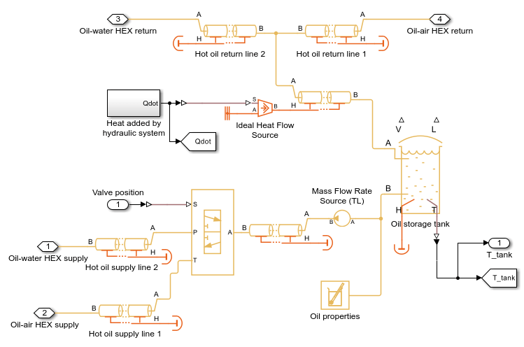 The system is subjected to intensive heating and as the result, the oil temperature in the tank keeps rising. To prevent the oil from overheating, the primary oil-air heat exchanger absorbs heat from the system. In the case when the oil-air heat exchanger cannot maintain the tank temperature below a threshold, the second oil-water heat exchanger is added to the system to further absorb heat. The oil-air heat exchanger is the E-NTU Heat Exchanger (TL) block with the air-side flow controlled by physical signal inputs. The flow of the oil into each heat exchanger is regulated through the 3-Way Directional Valve (TL) block.