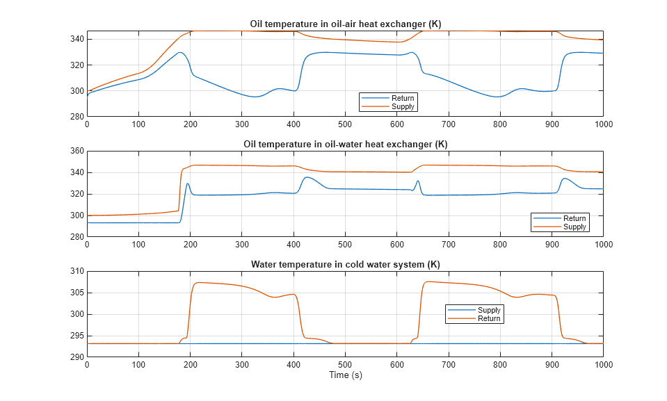 These plots show the temperatures of hydraulic oil and water in the two heat exchangers. The oil-air heat exchanger primarily absorbs heat from the system. In the case when the oil temperature in the tank reaches a threshold, the 3-way directional valve diverts most of the flow to the oil-water heat exchanger to further lower the temperature.