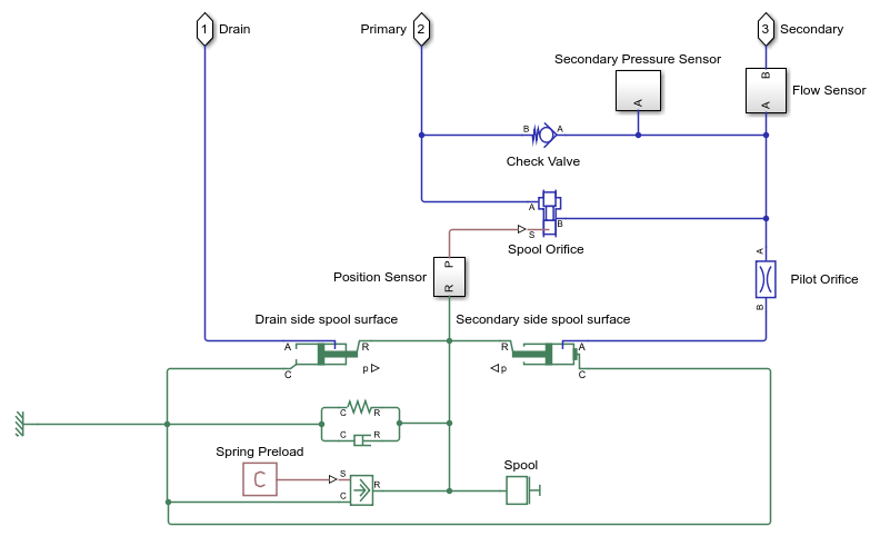 The following figure shows the model of a pressure reducing valve. The primary port of the valve is connected to a pressure source that receives a constant input. The pressure source here represents a pump or prime mover which is connected to a reservoir. The pressure at the secondary port is gradually increased with a ramp input. The drain port is connected to a reservoir. This model represents a direct acting pressure reducing valve with an external drain and a check valve.