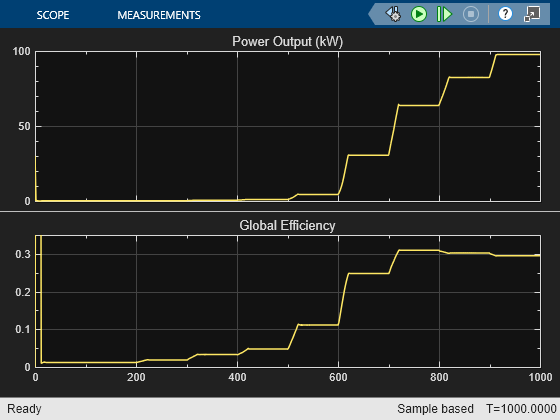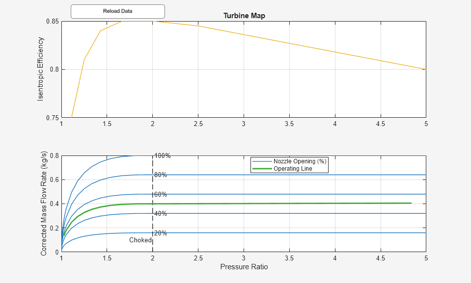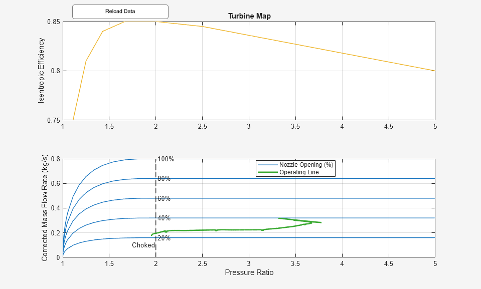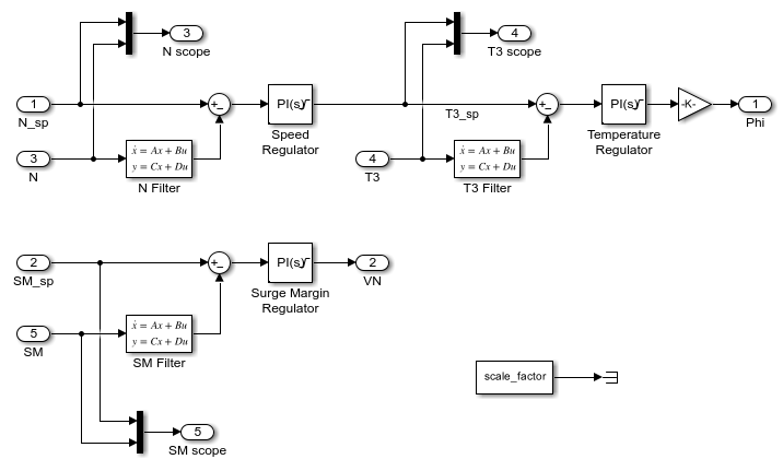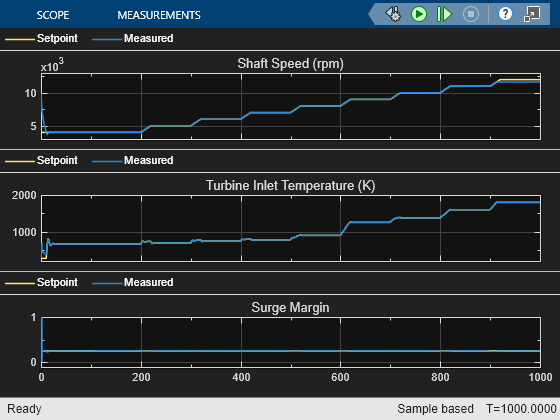 Three PID controllers regulate the shaft speed, the turbine inlet temperature, and the compressor surge margin. System inputs are defined for three scenarios: varying shaft speed, varying surge margin, and varying APU vane opening. Running the first scenario produces the typical operating line on the compressor map. Running the second and third scenarios show where the maximum power output and maximum global efficiency occurs.