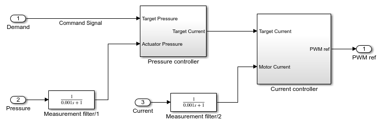 This subsystem shows how the servo controller is modeled. There are two control loops. The inner loop controls the motor current and the outer loop controls the pressure in the actuator.