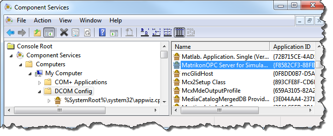 4. Locate your OPC server in the DCOM Config list. The example below shows the Matrikon™ OPC Server for Simulation.
