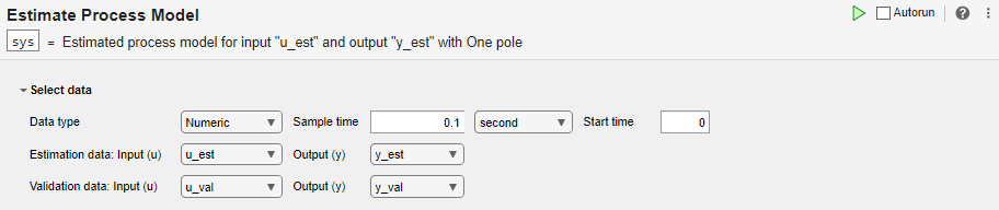 The Estimate Process Model task lets you interactively estimate and validate a process model for SISO systems. You can define and vary the model structure and specify optional parameters, such as initial condition handling and search methods. The task automatically generates MATLAB® code for your live script. For more information about Live Editor tasks generally, see Add Interactive Tasks to a Live Script.