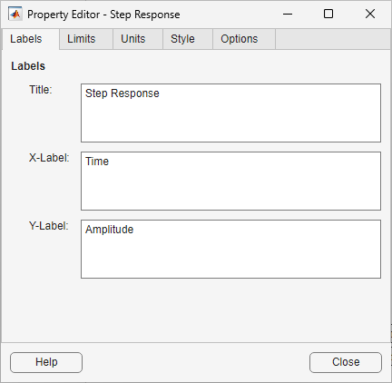 In general, you can change the following properties of response plots. Only the Labels and Limits tabs are available when using the Property Editor with Simulink® Design Optimization™ software.