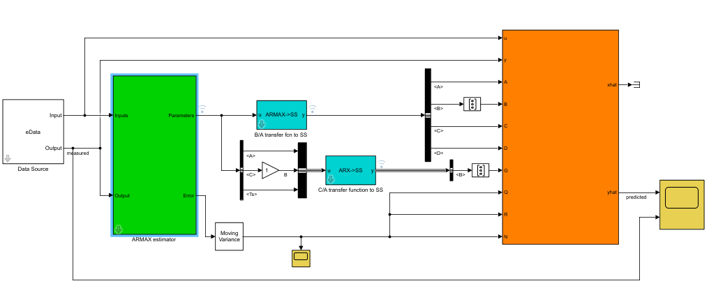 For this example, use a recursive ARMAX estimator. Then compute the A, B, C, D matrices and process noise matrix G from the estimated parameters using the Model Type Converter blocks.
