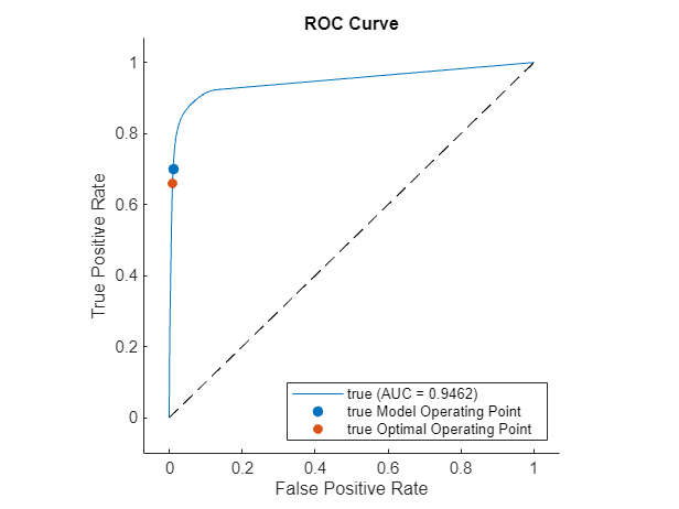 figure plot(roc) hold on scatter(roc.Metrics.FalsePositiveRate(threshIdx), ... roc.Metrics.TruePositiveRate(threshIdx), ... "filled",DisplayName="true Optimal Operating Point") hold off