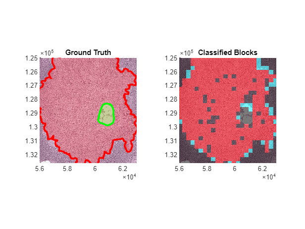 idx = 27; figure tiledlayout(1,2) nexttile hBim1 = showCamelyon16TumorAnnotations(testImages(idx),testAnnotationDir); title("Ground Truth") nexttile hBim2 = bigimageshow(testImages(idx)); cmColormap = [0 0 0; 0 1 1; 1 1 0; 1 0 0]; showlabels(hBim2,bcmatrixImage{idx}, ... Colormap=cmColormap,AlphaData=bcmatrixImage{idx}) title("Classified Blocks") linkaxes([hBim1.Parent,hBim2.Parent]) xlim([56000 63000]) ylim([125000 132600])