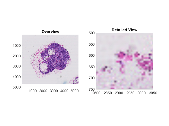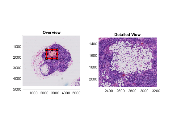 In the overview image, draw a rectangle ROI. This example specifies the initial size and position of the rectangle programmatically by setting the Position property as a four-element vector of the form [xmin,ymin,width,height]. After the ROI appears on the overview, you can adjust the size and position of the ROI interactively.
