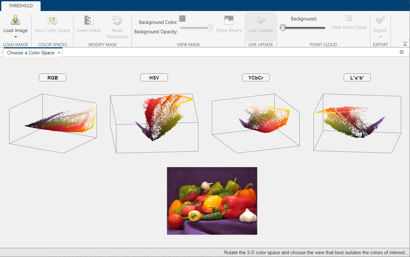 Color Thresholder displays the image in the Choose a Color Space tab, with point clouds representing the image in these color spaces: RGB, HSV, YCbCr, and L*a*b*. For color-based segmentation, select the color space that provides the best color separation. Using the mouse, rotate the point cloud representations to see how they isolate individual colors. For this example, start by selecting the YCbCr color space.