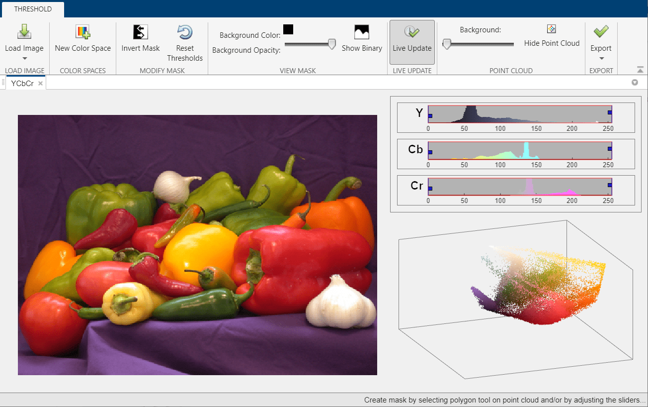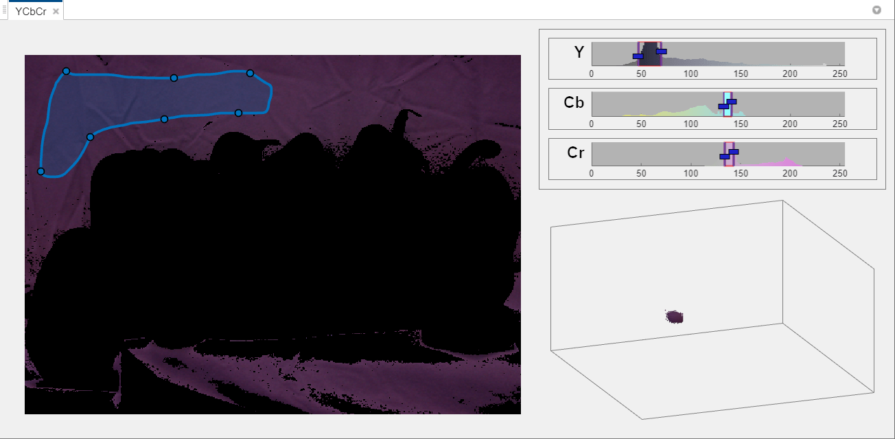 When you choose a color space, Color Thresholder opens a new tab, displaying the image along with a set of controls for each color component and the point cloud representation. The color controls vary depending on the color space. For the YCbCr color space, the app displays three histograms representing the three color components: the Y component represents brightness, the Cb component represents the blue-yellow spectrum, and the Cr component represents the red-green spectrum.