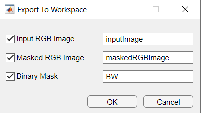 In the Export To Workspace dialog box, specify variable names for the binary mask image. You can also save the original input RGB image and the segmented version of the original image.