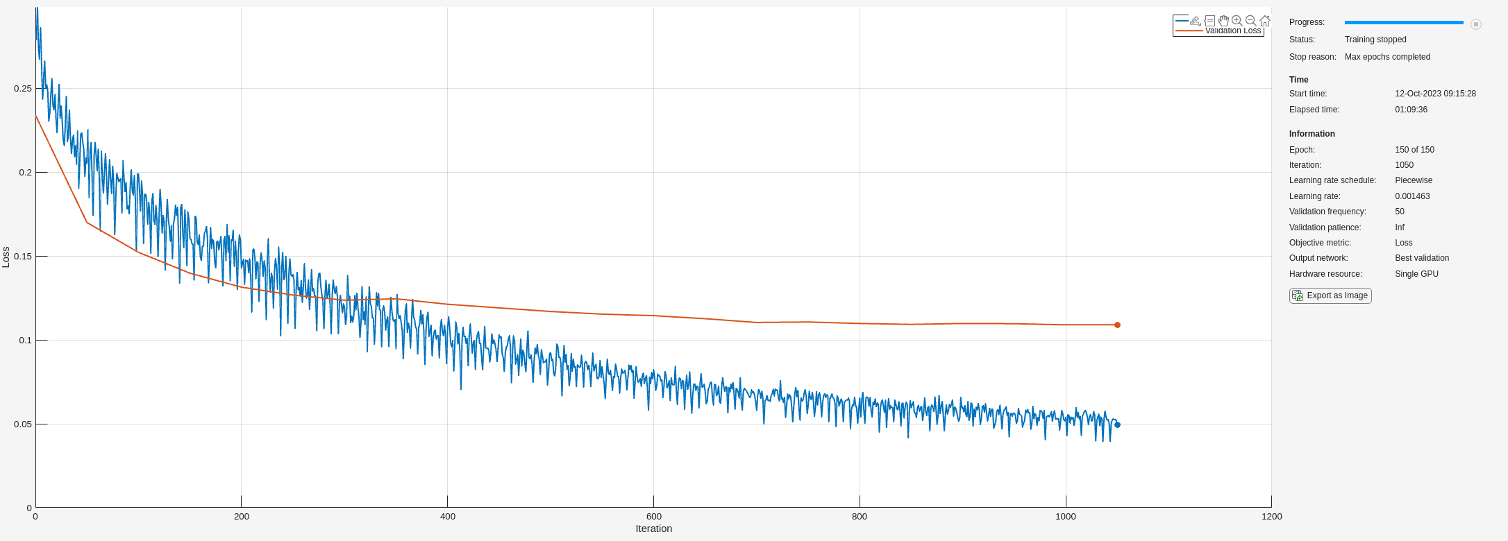 options = trainingOptions("sgdm", ... InitialLearnRate=3e-3, ... Momentum=0.9, ... MaxEpochs=150, ... LearnRateSchedule="piecewise", ... LearnRateDropPeriod=10, ... LearnRateDropFactor=0.95, ... Plots="training-progress", ... ValidationData=dsVal, ... TargetDataFormats="CB");